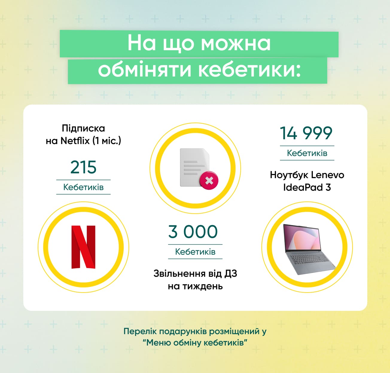 Зароблені кебетики можна обміняти на подарунки (1 кебетик = 1 гривня), бонуси або додаткові можливостів навчанні.